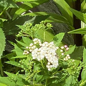 源平シモツケ 昨年、小さな挿し木の苗をお迎えして 花壇に植えました。 ちっとも大きくならなかったんですが、 今年になって、春から少しづつ伸びて やっとお花を咲かせ始めました❣️ まだ白いお花ですが、右の方に少しピンク色が見えてます💖💖 早くピンクも咲いて🙏🙏🙏