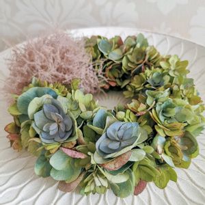 秋色紫陽花のリース作りました 緑がかった青色が好きだなぁ♡ ご予約ありがとうございました