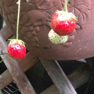 四季なりの紅い花のいちごが、赤くなってきました。✌️目を離した隙に、孫に赤くなっていないものまで取られてしまいました😅