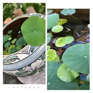 庭のメダカ鉢が とても涼し気 でも ハスは咲きそうもないです 花芽がみつかりません