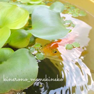 金魚の金さん あれから、10年経ちました笑 あれからというのは、お祭りで救って?来てから😁 余りに大きいので、今年から外に出してオケに引越ししました。 たっぷりの水はやはり気持ちいいのか、水草が美味いのか😋元気元気のご老人です。