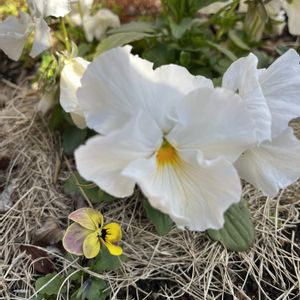 ち〜さな種蒔きっ子のビオラが 咲いてくれました🤗 横にいるのは 購入したパンジー🤍 大小の対比がちょっと面白い🤗