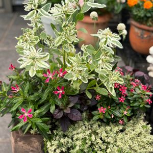 🧡日曜日はビタミンカラーの日❤️💛 ①道路端の歩いてる人にも元気をあげたくて、歩いて見える所にこの寄せ植えを置いています。 本当は班入りの葉っぱ🌿は赤い花のペンタス❤️…植え付けた時は咲いていたのに、梅雨の間に花が無くなり、逆に他の花がモリモリしちゃいました😅💦 ツボミはあるようなので、❤️また咲いたらアップ⤴️したいと思います。 ②その寄せ植えの一部をアップ⤴️ 黄色のマリーゴールド💛はお花屋さんで他のマリーゴールド🧡と3ポットで、100円という見切り品でしたが、見事に咲いてくれました👍💕 赤ペンタス❤️の班入りの葉っぱ🌿と奥のベロニカハミングバード💜とコルジリネ🤎と奇跡のコラボ😆…👍✨ ③前回も投稿しましたが、ニチニチソウ『かざぐるま』🤍🩷と一緒に寄せ植えしている白のSUNTORY『サンク・エール』🤍も暑い中どんどん咲いてくれて、爽やかさ増し増し❣️ ④爽やかセダム💚にも黄色いお花💛が咲きました👍✨…可愛い〜😍 ⑤去年お迎えしてお気に入りになったニチニチソウ『爽夏』💜🤍…涼しげなお色💕 またお迎えしました😊✨ 夏☀️だから、逆に暑さに負けないビタミンカラー🧡💛❤️で元気を貰おう✊✨ そればかりだと暑苦しいので、やはり爽やかなお花💜🤍💙もないとね😉💕