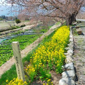🍀🌻🪴💐🌹🌻🍀 🍀🩷💛桜と菜の花💛🩷🍀 🌸信州安曇野穂高川右岸は、唱歌早春賦のモデルとなった場所として早春賦歌碑が建てられています 🌸旧制長野県立大町中学(長野県大町高等学校の前身)の校歌の制作のために訪れた吉丸一昌が、大町市から安曇野一帯の早春の情景をうたった歌とされ、大町〜安曇野の寒さ、そして春の暖かさを歌った歌詞です 🌸この場所で毎年早春賦まつりが開催されます、穂高川の堤防沿いにあります 🌸菜の花と堤防沿いに植えられた桜とのコラボレーションがとても素敵です 早春賦 作詞者:吉丸一昌 作曲者:中田章 春は名のみの 風の寒さや 谷の鶯 歌は思えど 時にあらずと 声も立てず 時にあらずと 声も立てず 氷融け去り 葦は角ぐむ さては時ぞと 思うあやにく 今日もきのうも 雪の空 今日もきのうも 雪の空 春と聞かねば 知らでありしを 聞けばせかるる 胸の思いを いかにせよとの この頃か いかにせよとの この頃か 🍀🌻🪴💐🌹🌻🍀