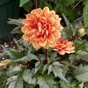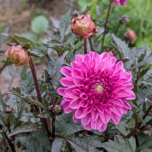 レディダリアのアルナです♪ 3年目くらいです。銅葉がおしゃれでシックなお花です♪ 隣のチョコレートコスモス(まだ蕾)も3年目です♪開花のリレーが始まると楽しみですよね✨ 今年こそは重い腰を上げてダリア分球したいです(*´꒳`*)👍