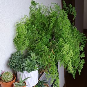 アバレルくんのハオさんと モリモリモリモリ~のアジアンタムさんと ちーちゃんからいただいたナンチャラアロエさんと 蕾の気配はあるのに動きのないサボさんです…😄