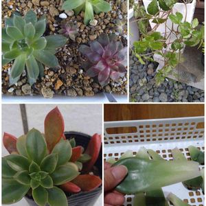 先日いただいた子たち💚 ↖持ってないセンペルさん ↙名前がわからないけど可愛い子♥寒くなると、赤くなるのかな😁 ↗シュガーバイン🌿リベンジです! ↘めちゃくちゃデカいシャーロットを胴切りさせてもらいました!こんなに大きな葉❢芽や根出るかな!? 胴切りも楽しい時間でした♪ ありがとうございました😊💕💕