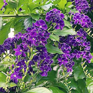 四方に細枝を沢山伸ばしながら、クッキリとした濃い青紫色に白い縁取りのある美しい花を咲かせる「デュランタ ・タカラヅカ」で、おはようございます✨💜☺️💜✨ 今夏もマンションの中庭にエレガントなアーチで涼し気な一角を作り、居住者の目を愉しませてくれています🎶 資源ゴミを出しに行く度に目に留まり、癒やされています💞 "デュランタ・タカラヅカ"は中南米や西インド諸島原産のクマツヅラ科の半耐寒性低木🇧🇷 熱帯性植物のため、灼熱のような真夏の暑さには非常に強い一方で、寒さには弱く、耐寒温度は5℃以上とのこと☀ 霜に当たると枯れる可能性が高まり、日当たりの悪い環境では花つきも悪くなるとか。 しかしながら、概して生育旺盛で剪定に強く樹形をコントロールし易い為、庭木の植栽に適した植物と言えますね🍃🦚🍃 ー花言葉は、「歓迎」、「目を惹く容姿」…他。