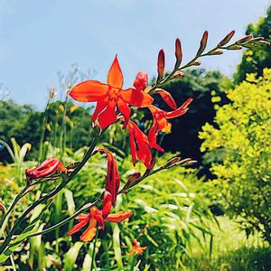 ぐんぐん花茎を伸ばして生長する、「姫緋扇水仙(ヒメヒオウギズイセン)」でおはようございます🧡😉🧡 トロピカルな雰囲気のビタミンカラーが、夏空によく映えていました☀️ "ヒメヒオウギズイセン"は、南アフリカ原産のアヤメ科の球根植物🇿🇦 -15℃から40℃近くまで耐えることができる強靭な植物で、こぼれ種でも増える繁殖性の高い植物だそうですね🧊🌿🌞 明治時代中頃に日本に渡来🇯🇵 現在では、野生化して群生する場所も各地に見られるのだとか👀✨ ー花言葉は、「楽しい思い出」、「謙譲の美 」…他。