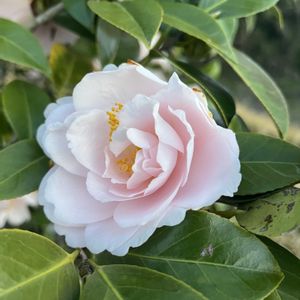 白に少しピンクが入ったツバキです。癒されますねー。 (*^ω^*)