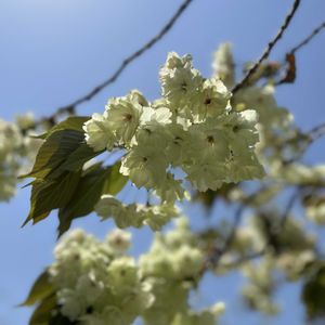 御衣黄(ギョイコウ)さくらです。 おしゃれな花の形をしてますねー♪ (*´∀`*) 緑色の花で江戸時代に京都の仁和寺で栽培されたのがはじまりと言われています。(*'ω'*)