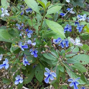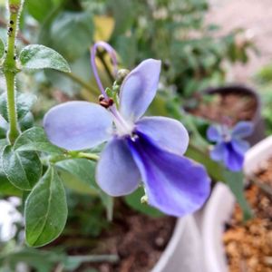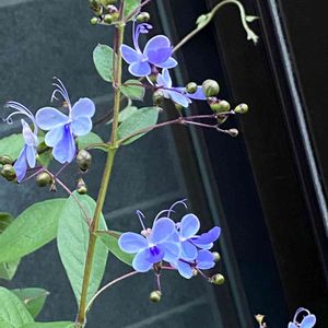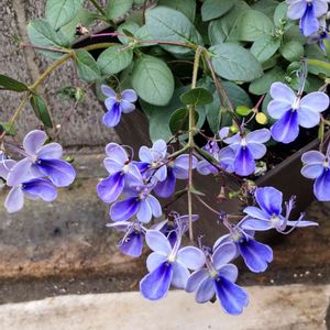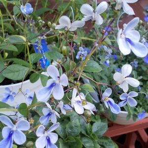 🦋クレロデンドルム・ブルーウィング 夏より秋の方がきれいな色で咲いています💙 3年程前に寄せ植えで使った3.5号程の小さな苗が、今では7号鉢いっぱいに広がり、もう倒れそうです💦 外管理で冬越しに失敗して、蕾が出来なかった年もありました。 剪定後は部屋で冬越しをしなくてはなりません。 みなさんもそうされてるのかな… 置き場所確保が悩みの種です😅🌀