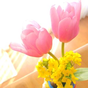 💛💓もうすぐ春に💓💛 ①リビングに春を飾りました🌷🌷💓 菜の花は、ハート型に💛 ②娘が数年前に図工の時間に作ったペン立てを 花瓶のカバーにしてみました😊🐻❄️🌈💙