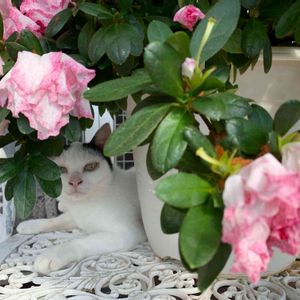 毎日遊びに来るご近所の猫ちゃん🐈 (今日のお花)アザレアの陰で一休み かな~☺💕