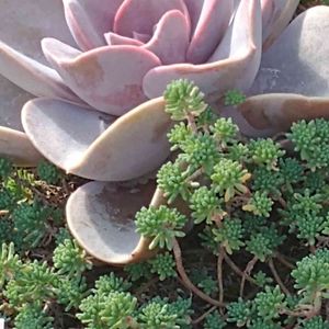 友人宅の多肉クン🌱玄関先で元気ね マンネングサの緑の中に、花のようなエケベリア🌺 ブルーピンクのバラが咲いたよう💓