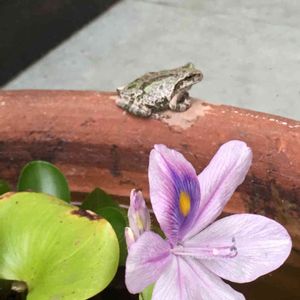 おはようございます❗️布袋草の花と、珍しい柄のカエル❗️用心して触らず写メしました❗️