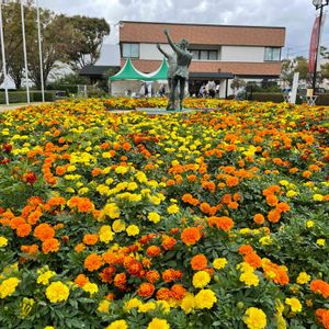 こんばんは🌇 昨日の久留米石橋文化センターのマリーゴールドです🌼🌼 入り口近くに沢山植えられています💕 うちもタネを植えてまだ小さい苗です🌱🌱