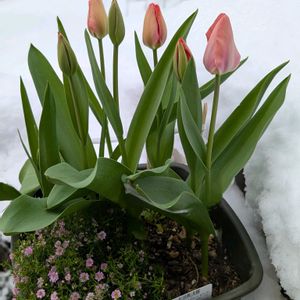 気がつけば……2月や〜 😯!! 久しぶりに 投稿するのは、 前回の 「アイスチューリップ🌷」さん の様子です 🌷🌷🌷🌷🌷 重い鉢を 朝 セッセッと、庭へ 夕方は また 家の中 玄関内(寒い🥶)に 置いたり…… 2、3日前から 夜はリビングに 入れたら… さすがに 暖かいのか 急にひとつだけ 🌷 蕾が 開き始めました〜🎶💓 他の 蕾も 膨らんで ほんのり色が ではじめています。