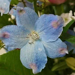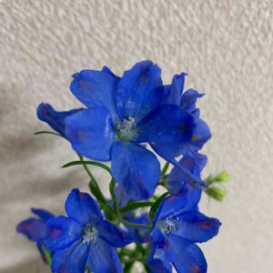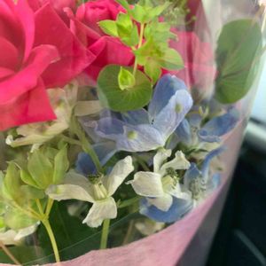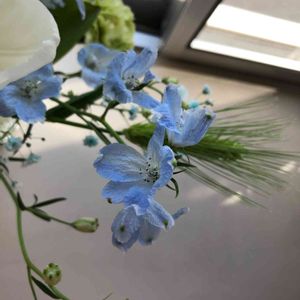 💐花束からのアレンジ💐 娘がいただいてきた花束 (ネモフィラのイメージだそう🥰) うちにあった蓋をなくしたポットに アレンジして 花束についてた不織布とリボンで くるみました デルフィの蕾も開いてきて、 良い感じになりました …伝わるかなぁ