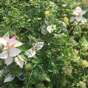 グリーンの中に、白さ際立つハツユキカズラちゃん。 白い子は、すこし頭だしてアピールしてるみたい♡