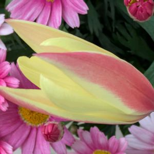 【原種チューリップ開花】 朝はいつも蕾で 帰ったら夜で蕾の原種チューリップ 今朝みてみると少し開いていました 嬉しいな〜 スクスクと育っているマーガレットの隣で咲いています ①この色合いいいな ②マーガレットと一緒に ③少し開いたお顔の中