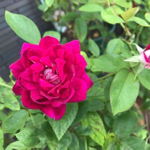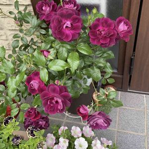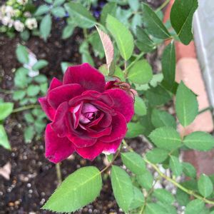おはようございます☀ 相変わらず風が強くて、水はからっからで、鉢はあちこち転がってます😭 揺れが止まった隙に瞬撮 笑 「バーガンディ アイスバーグ」。 この色、大好き🥰 子どもの頃に庭に植えられてたバラがこんな黒っぽいバラで、(記憶は定かではないけど、夜店で買ってきたんじゃなかったかな?)もちろん名前も知らなかったけど、今でもなぜか覚えてて、今でもバラといえばこんなイメージです。