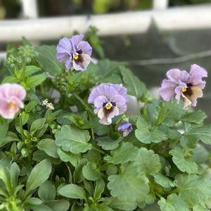 よく咲いてくれるスモーキーヴェール お顔がレディちゃんみたいだ この友膳さんのターコイズブルーのバスケットの寄せ植え 不意に作ったんだけど色合い好きすぎる teftefさんオリジナルビオラ スモーキーヴェール ロータス・ブリムストーン キュート ビオレッタ ・サニーサンライズ ・ミスティックブルー