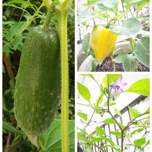 パプリカらしいお顔に🟡 赤はまだ🟢のまま* 長細紫ピーマンは茄子と同じ色の花💜 小ぶりきゅうりは太っちょに(^0_0^)