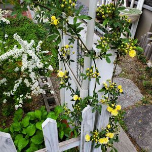 おはようございます😄👋 娘の家のモッコウバラが咲き始めていました~🎶ユキヤナギとコラボで可愛い~😆💕