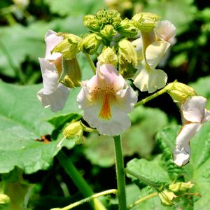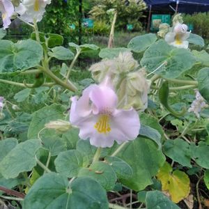 薬用植物園の花 ツノゴマ ツノゴマ科の被子植物 北米南部〜メキシコ原産 葉、花とも粘液をだす。実は、ナス型 で秋に黒くなりパックリ割れる。 割れた両方の端が尖り、ツノ2つの ユニークな形で悪魔の爪とも言われる。 若い果実をピクルスに利用。