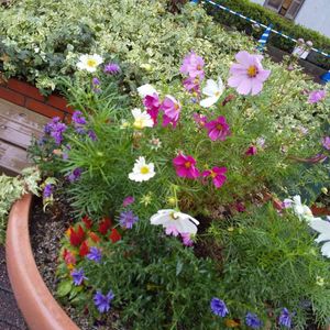 今日のお出かけ先… デパートの中庭に… 秋色寄植え見〜つけた!(*˘︶˘*).。.:*♡🌸💕🤍💜🌿… 秋桜と…八重咲きクジャクアスターかな?😀!…