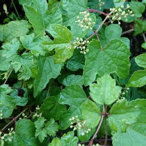 🌱野に咲く花🌱 つる性植物 花は直径3~5mm 黄緑色で地味 花弁と雄蕊は早く落下する 雌蕊の花柱だけが残り〰︎ これからカラフルな果実となる、 花盤から蜜が出ているため たくさんの昆虫🐜がやってきます 野葡萄(のぶどう) ブドウ科🍇