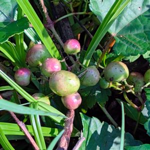 こんにちは 去年から我が家に生えてきた野葡萄 チョキ✂️しながら見守ってます🌿 鮮やかグリーンの葉っぱ💚 少し前から小さな実がついてきました♪ →→3枚目はお花? 4枚目はミニパプリカ 細い葉に上向きに付く実🫑 色づくのを待ってます😊 🏷️8日は葉っぱの発表会