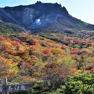 姥ヶ平からの紅葉と茶臼岳🍁 素晴らしい秋の一枚‼️😍 ただねぇ、全力紅葉からすると7掛け程度かな?⁈ ここはベニサラサドウダンがメインのようだけど、残念ながら全力発色してなくて茶色っぽい😓 周りの山もくすんだ茶色なので今年はハズレ…というか全然冷え込まなくて暑すぎ❗️😡