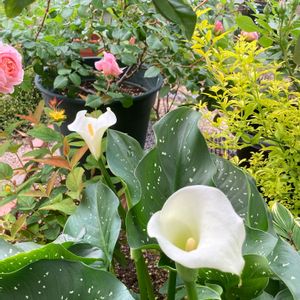 こんにちは☁️ まだ降ってません 予報を信じず朝水やりしました😅 斑入りカラー🤍🤍🤍5月20日 今年は沢山の花を咲かせてくれました✨✨✨ 暴れん坊のバラと😅