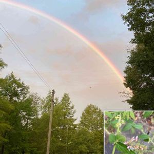 おはようございます⛅️☀️ 穏やか、ちょっと☁️だけど。 朝の散歩で。 珍しく西の空に虹が🌈✨✨✨ 咲いてるのは萩? 青?ピンク? 教えて下さい🙏 アレチヌスビトハギ、っていうのがあるそうです。葉っぱもにていますね。