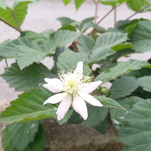 ブラックベリーの花が咲きました😝 八重の花を購入した気がするんですが、花びらは普通と違って縮れているのでまだ本芸が出ていないということでしょうか🤔