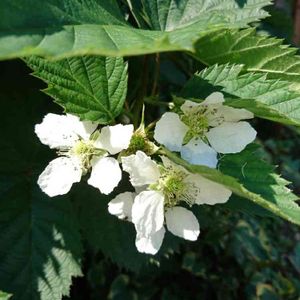 【黒実木苺】 ブラックベリー(ボイソンベリー) たわわに実る黒い実が印象的ですが、可憐な花は薄く軽やか ヒラヒラと風に揺れます。 純粋にブラックベリーと思ってたのですが、ラズベリーとの交配種だそうです。