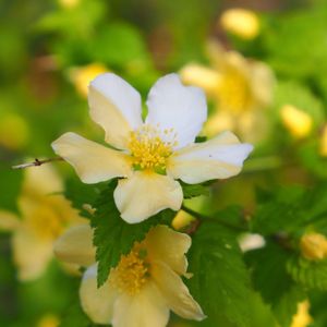 今日の花 ヤマブキ 白花ヤマブキは今朝見たら実がついてました〜2枚目はその白花 3枚目は斑入り黄色のヤマブキの葉っぱ🌿 4枚目 レモンイエローの金露梅