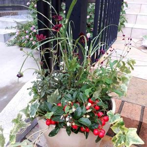 門扉前に秋の寄せ植えを置きました 今の時期は端境期なので、長く楽しめるものを植えるのは向かない時期かも…。 でも、短い秋を楽しむものと、割り切って生け花的に植え込み! しかーし、チェッカーベリーがクリスマス的???