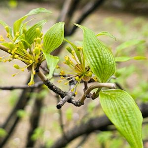 サンシュユ 八味地黄丸に配合されているGSの今日のお花 山茱萸💛 丸い花芽の総苞片は4枚というが、互い違いに2枚ずつ重なっていて外側に見えるのは2枚、ハルコガネバナと呼ばれる、あの鮮やかな黄色を隠している🟡 葉芽は細長くて、側芽は普通二輪生🌱 頂芽とともに花よりあとに展開する🟩 どちらも柔らかな毛に包まれている 木曜日は木🏷(ノ)・ω・(ヾ)