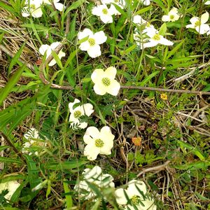 *ハナミズキ(花水木) アレッ?草の中に… よーく見ると、伐採された幹から新枝を伸ばして 地面を這うように、咲いてました🌿💠 花言葉…永続性