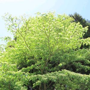 今日のお花 展開する新緑が美しい サンシュユ 花は終わって新葉へと移行中 2024.4.9のことです このサンシュユの横には 「みどりのまとめ」に記載した被爆樹木ソメイヨシノが立っています