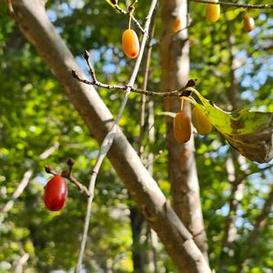 2025.10-11 豊橋にしばらく滞在したおりに 豊橋のんほいパークの植物園を見学しました 季節がらか花は少なく もっぱら樹木を見て回りました 赤い実をつける木本がいくつかありました これはサンシュユですね これは以前見たことがありすぐわかりました 秋になると鮮やかに赤く熟すため アキサンゴ(秋珊瑚)という別名がある 甘酸っぱくて美味しいらしいがなぜかほとんどの野鳥には人気がないそうです 樹皮は剥がれ落ちまだら模様になり これがこの樹木の魅力の一つともいわれます(3枚目) 株立ちの美しい樹形です