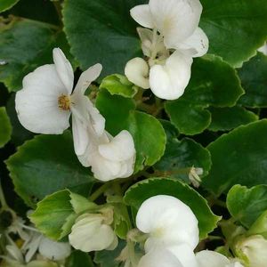 ベゴニアの3色目白、玄関で咲いてくれています。💕 3色並んで、楽しませてくれています。💕 白、ピンク、赤と並べて、置いています。💕 日陰好きの、インパチェンスの白と八重のピンクも、置いています。 一重の白は、次々咲いてくれています。💕
