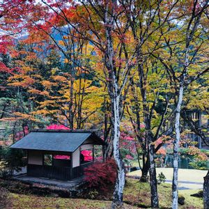 11月2日、日曜の大混雑を避けて、月曜日に出掛けることに❗️ 前日光の隠れた名所、古峯ケ原(こぶがはら)の古峯神社⛩の奥座敷「古峯園」(こほうえん)は、今が、紅葉🍁🍂のピーク❗️ 古峯園内の東屋と周囲の紅葉🍁🍂
