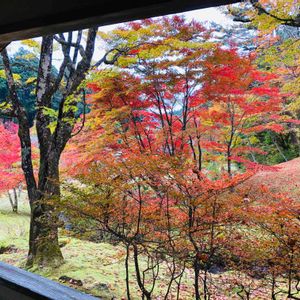 11月2日、日曜の大混雑を避けて、月曜日に出掛けることに❗️ 前日光の隠れた名所、古峯ケ原(こぶがはら)の古峯神社⛩の奥座敷「古峯園」(こほうえん)は、今が、紅葉🍁🍂のピーク❗️ 古峯園内の、美しい紅葉🍁🍂の中に立つ、東屋の窓越し‼️