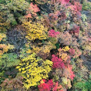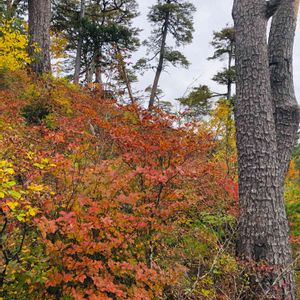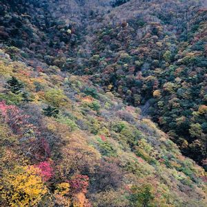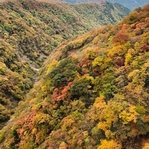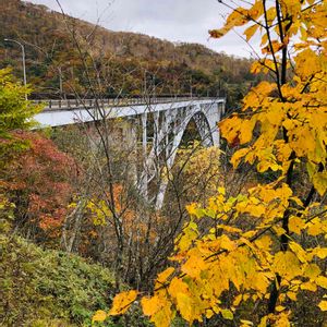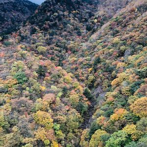 10月18日、混雑を避けるため、すこし早いかもの?、奥日光男体山の裏側、紅葉の名所「瀬戸合峡」を目指し、日光霧降高原回って、出かけてきました❗️ 霧降高原キスゲ平を過ぎ、以前は、自殺の名所と呼ばれ、橋に柵が設けられた、標高1433mにある「六方沢」附近から見た、稜線の紅葉🍁🍁🍁‼️