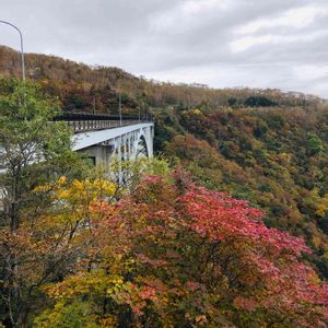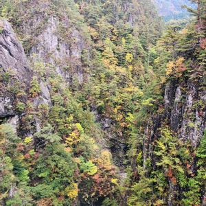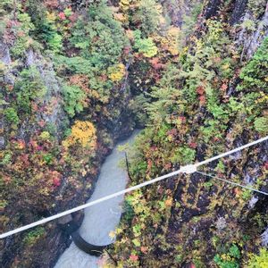 10月18日、混雑を避けるため、すこし早いかもの?、奥日光男体山の裏側、紅葉の名所「瀬戸合峡」を目指し、日光霧降高原回って、出かけてきました❗️ 「瀬戸合峡遊歩道入口」から坂を下り、更に、片道460段の階段を登り降りして、 川俣ダム正面にある「瀬戸合峡 わたらっしゃい吊り橋」へ、 川俣ダム正面にある「瀬戸合峡 わたらっしゃい吊り橋」から、ダム下の峡谷に広がる、紅葉🍁🍁🍁の様子‼️