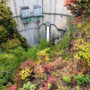 10月18日、混雑を避けるため、すこし早いかもの?、奥日光男体山の裏側、紅葉の名所「瀬戸合峡」を目指し、日光霧降高原回って、出かけてきました❗️ 「瀬戸合峡遊歩道入口」から坂を下ると、島々が浮かぶ様な光景の、川俣ダム目前のダム湖が現れる❗️ 川俣ダム正面にある「瀬戸合峡」周囲の山⛰の、紅葉🍁🍁🍁の様子‼️